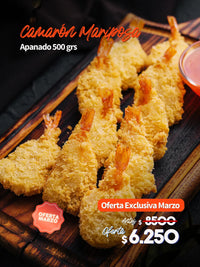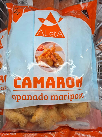 Camarones seleccionados, abiertos en corte mariposa y recubiertos con apanado crujiente. Presentación en bolsa de 500 gramos, congelados para conservar calidad y frescura. Producto listo para freír, hornear o preparar en air fryer.