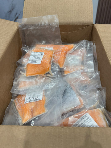 Características: Trozos de salmón con piel, con peso entre 100 y 200 gramos por unidad. Empaque de 5 kg. Producto congelado.